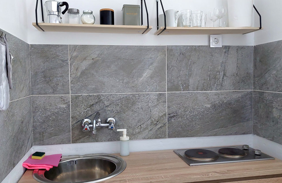 Kompletna kuhinja- dvije ploče za kuhanje, mikrovalna pećnica, kuhalo za vodu, toster, filter&mocca aparati za kavu, hladnjak. Sve posuđe. Sol, papar, osnovni začini/začinsko bilje, kava, čaj i šećer.